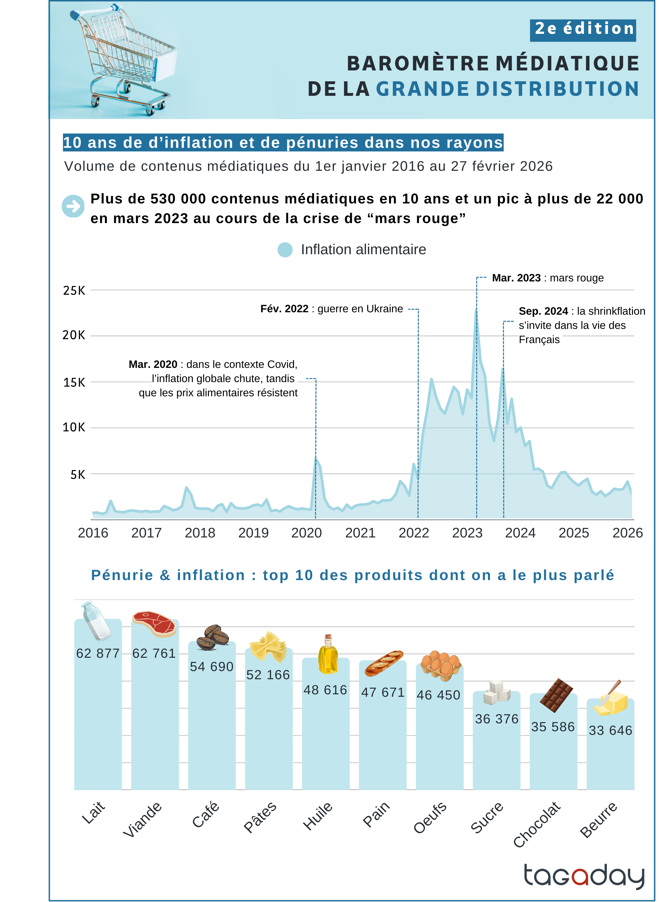 Plus de 530 000 contenus médiatiques en dix ans et un pic à plus de 22 000 en mars 2023 au plus fort de la crise inflationniste : l'inflation alimentaire reste un sujet structurant du traitement médiatique de la grande distribution.